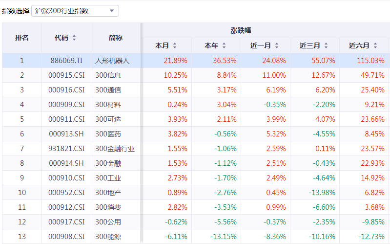从区间涨跌幅看,无论是本月、本年、近一月、近三月、还是近六月的表现,该板块指数涨幅都遥遥领先沪深300其他指数排名。