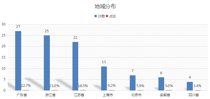 从地域分布看,按照省份划分,广东有27家,占比22.7%;浙江有25家,占比21%;江苏有22家,占比18.5%;上海有11家,占比9.2%;北京有7家,占比5.9%。
