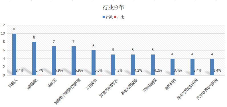 其中,机器人行业聚集了10家公司,占比8.4%;金属制品行业有8家,占比6.7%;电机和消费电子零部件及组装行业各有7家,占比5.9%;工控设备行业有6 家,占比5.0%。