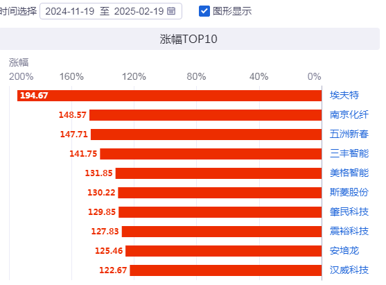 其中,埃夫特、南京化纤、五洲新春位居涨幅榜前三,分别高达194.67%、148.57%、147.71%。