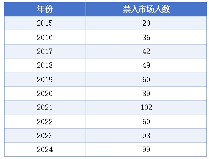 回溯过去十年,同花顺iFind数据显示,被禁入市场人数最多的2021年,有102人;最少的是2015年,只有20人。