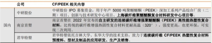 在技术方面,国外核心制造技术及相关装备都被严格保密,对中国实施严苛的封锁政策。目前,国内多家企业也在积极自主研发,加大投入进行CF/PEEK(碳纤维增强PEEK材料)研发工作。