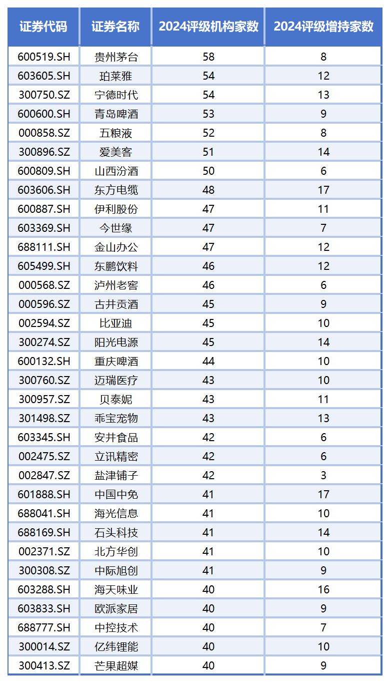 值得关注的是,贵州茅台、珀莱雅、宁德时代、青岛啤酒、五粮液、爱美客、山西汾酒7家上市公司评级机构家数超过或达到50家。