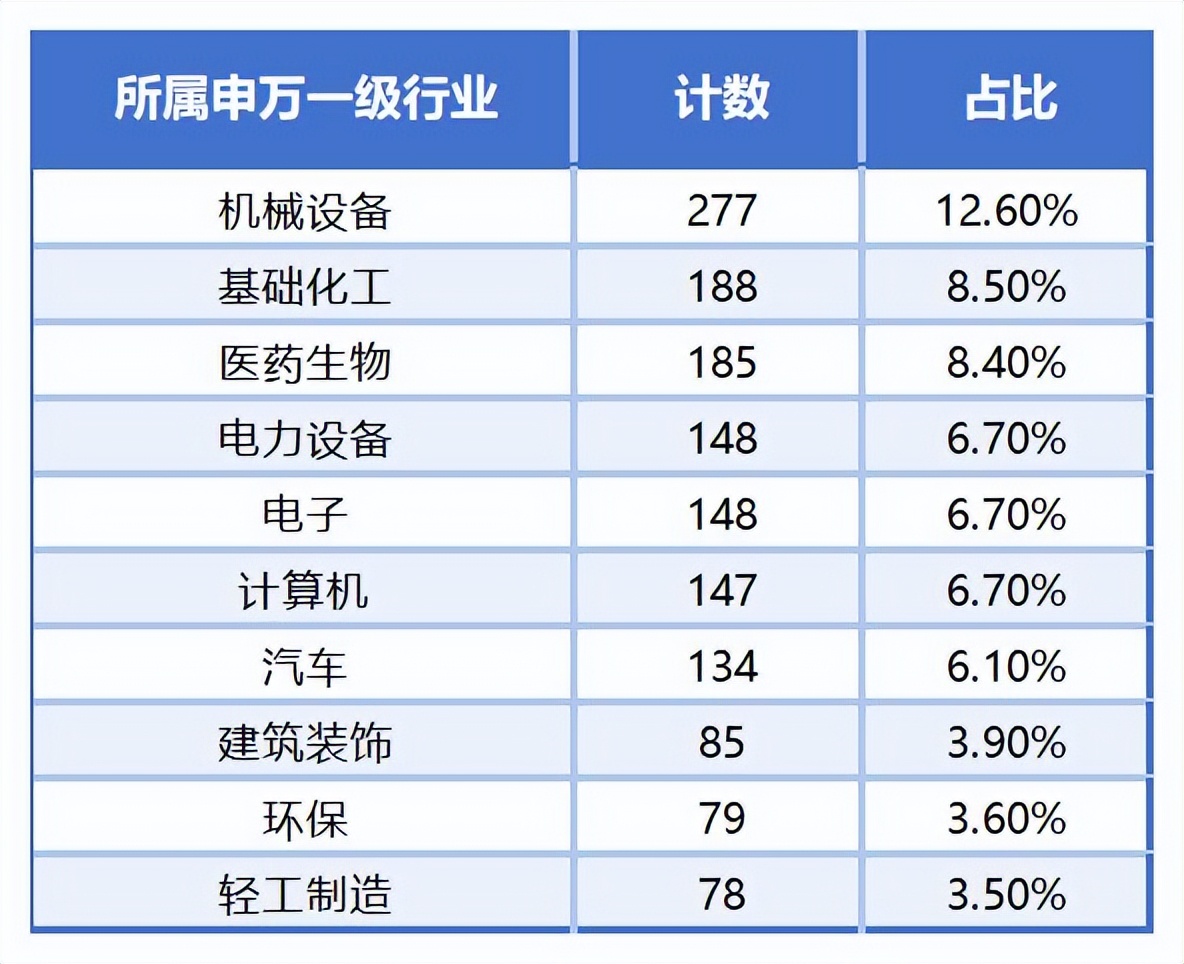 从行业分布看,在2200多家未获机构评级的上市公司中,机械设备、基础化工、医药生物、电力设备、电子、计算机、汽车等领域涉及上市公司均超过百家。
