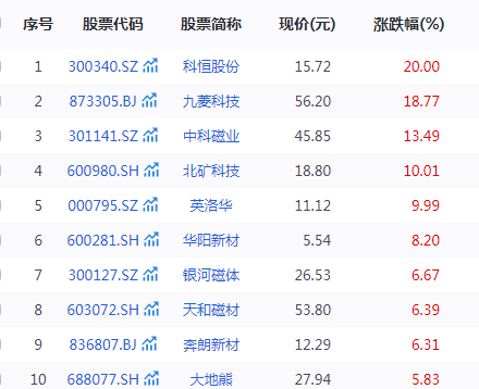 6月9日,市场全天震荡走高,稀土永磁板块涨幅居前。截至收盘,科恒股份(300340.SZ)涨20%,中科磁业(301141.SZ)涨13.49%,北矿科技(600980.SH)、英洛华(000795.SZ)涨停。