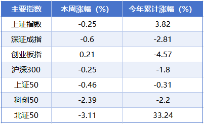指数层面,本周A股主要指数以调整为主。其中,北证50和科创50指数的调整幅度较大,分别下跌3.11%和2.39%。相对来讲,上证指数的表现较为稳健,本周微跌0.25%,今年以来累计涨幅为3.82%。