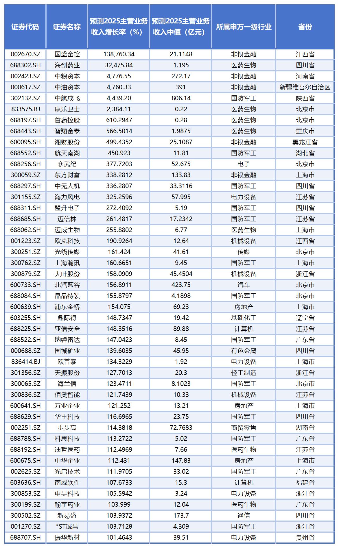 其中,国盛金控、海创药业、中粮资本、中油资本、中航成飞、康乐卫士6只个股预测2025主营业务收入增长率超过2000%,表现十分亮眼。