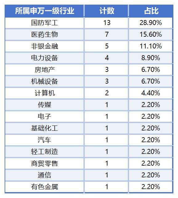 从行业分布看,按照申万一级行业分类,国防军工、医药生物、非银金融位列前三,占比分别达到28.9%、15.6%、11.1%。