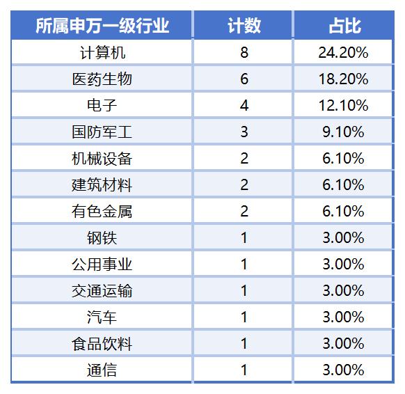 从行业分布看,按照申万一级行业分类,计算机、医药生物、电子位列前三,占比分别达到24.2%、18.2%、12.1%。
