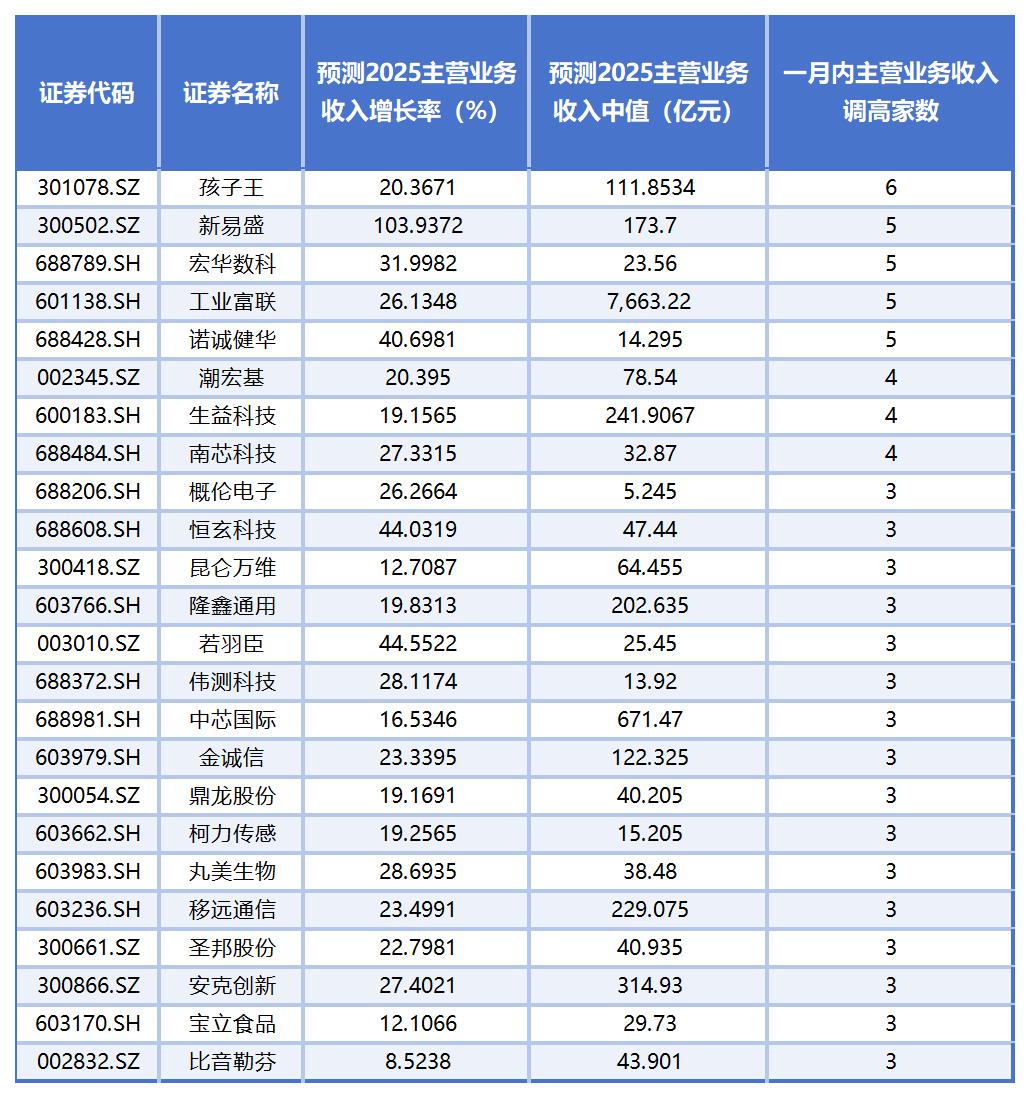 从最近一月内预测表现看,24家上市公司预测主营业务收入获3家及以上机构调高。其中,孩子王、新易盛、宏华数科、工业富联、诺诚健华或较多机构青睐。