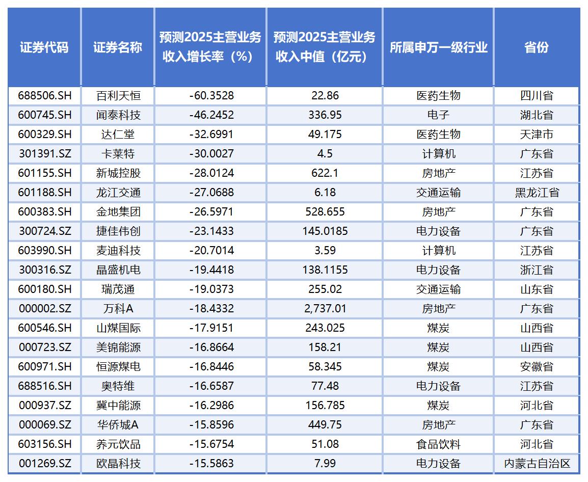 此外,176家预测2025主营业务收入增长率为负;135家预测2025净利润增长率为负;15家上市公司同时出现预测主营业务、净利润明显下滑。