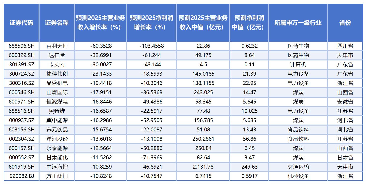 值得关注的是,预测2025主营业务收入增长率、净利润增长率下滑幅度均超过10%的有15家上市公司,具体包括百利天恒、达仁堂、卡莱特、捷佳伟创、晶盛机电、山煤国际、恒源煤电、奥特维、冀中能源、养元饮品、洋河股份、永泰能源、甘肃能化、中远海控、方正阀门。