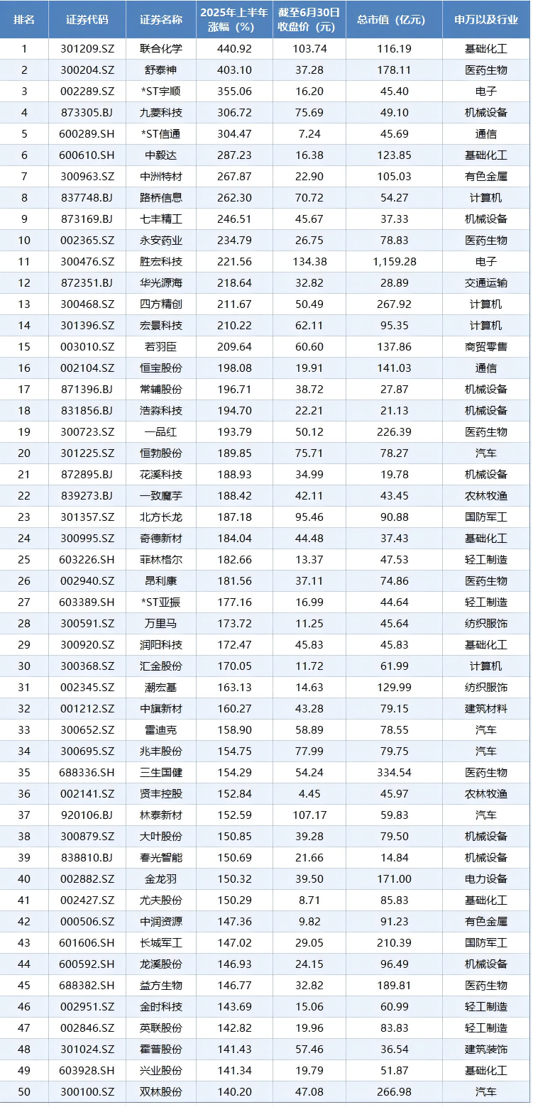 2025年上半年涨幅前十的个股中,科技股和医药股占据“半壁江山”。其中联合化学以上半年440.92%的涨幅排在榜首。