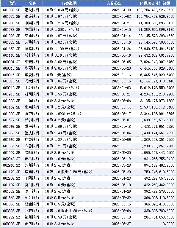 国有大行一直是分红的主力军,2024年六大行合计分红超4200亿元,占银行业总分红70%以上。今年上半年,所有银行股分红总金额达5063.02亿元。