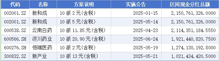 医药制造业以新和成、云南白药、恒瑞医药等企业为代表,6家上市公司分红金额超过10亿元。
