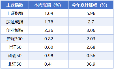 本周(7月7日至7月11日),A股三大指数延续涨势。截至周五收盘,上证指数累计上涨1.09%,深证成指累计上涨1.78%,创业板指累计上涨2.36%。