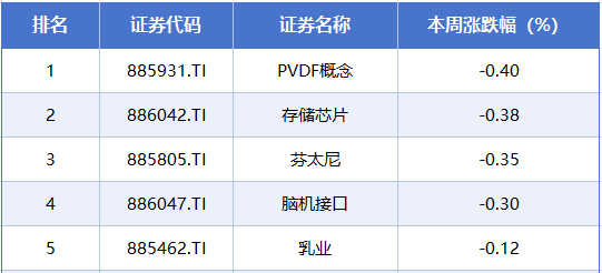 本周排在跌幅榜前排的概念板块分别是PVDF概念、存储芯片、芬太尼、脑机接口、乳业,累计跌幅分别为0.40%、0.38%、0.35%、0.30%、0.12%。