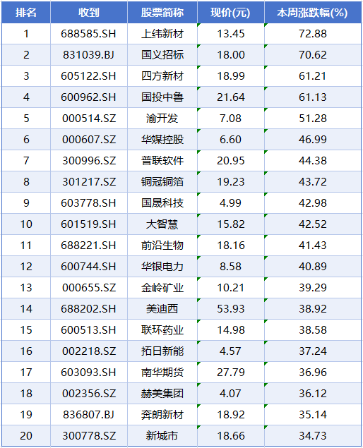 个股方面,本周个股涨幅榜前五位分别是上纬新材、国义招标、四方新材、国投中鲁、渝开发,累计涨幅分别为72.88%、70.62%、61.21%、61.13%、51.28%。