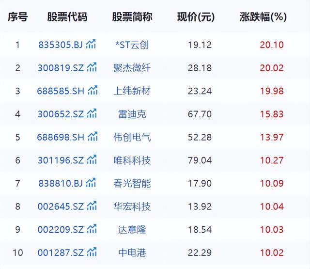 行业板块方面,机器人概念股涨幅居前。截至收盘,*ST云创(835305.BJ)、聚杰微纤(300819.SZ)、上纬新材(688585.SH)、唯科科技(301196.SZ)、春光智能(838810.BJ)、华宏科技(002645.SZ)、达意隆(002209.SZ)、中电港(001287.SZ)、电光科技(002730.SZ)、福达股份(603166.SH)、浙江荣泰(603119.SH)、豪能股份(603809.SH)、联发股份(002394.SZ)、君禾股份(603617.SH)等多股涨停。