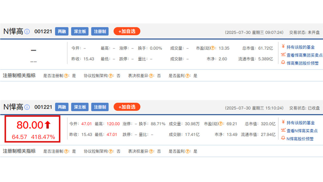7月30日,悍高集团上市后首次在二级市场交易,收盘股价大涨418.47%,达到80元/股,市盈率69.21倍,总市值达到320亿元。而在开盘前,悍高集团每股发行价格为15.43元,总市值为61.72亿元。由此计算,悍高集团上市首日,总市值飙升约258亿元。