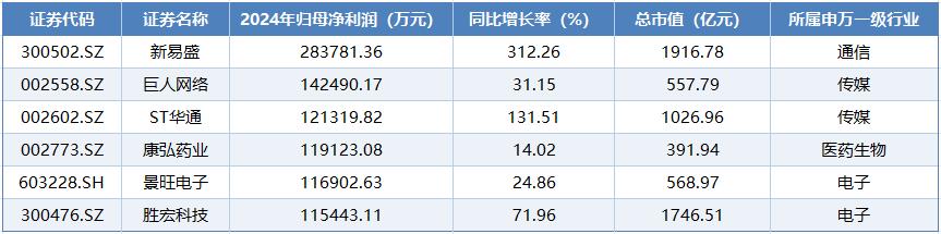 从企业业绩方面来看,翻倍股企业归母净利润普遍不高,190家翻倍股企业处于盈利状态,其中只有新易盛、巨人网络、ST华通、康弘药业、景旺电子、胜宏科技等6家企业去年归母净利润超过10亿元。