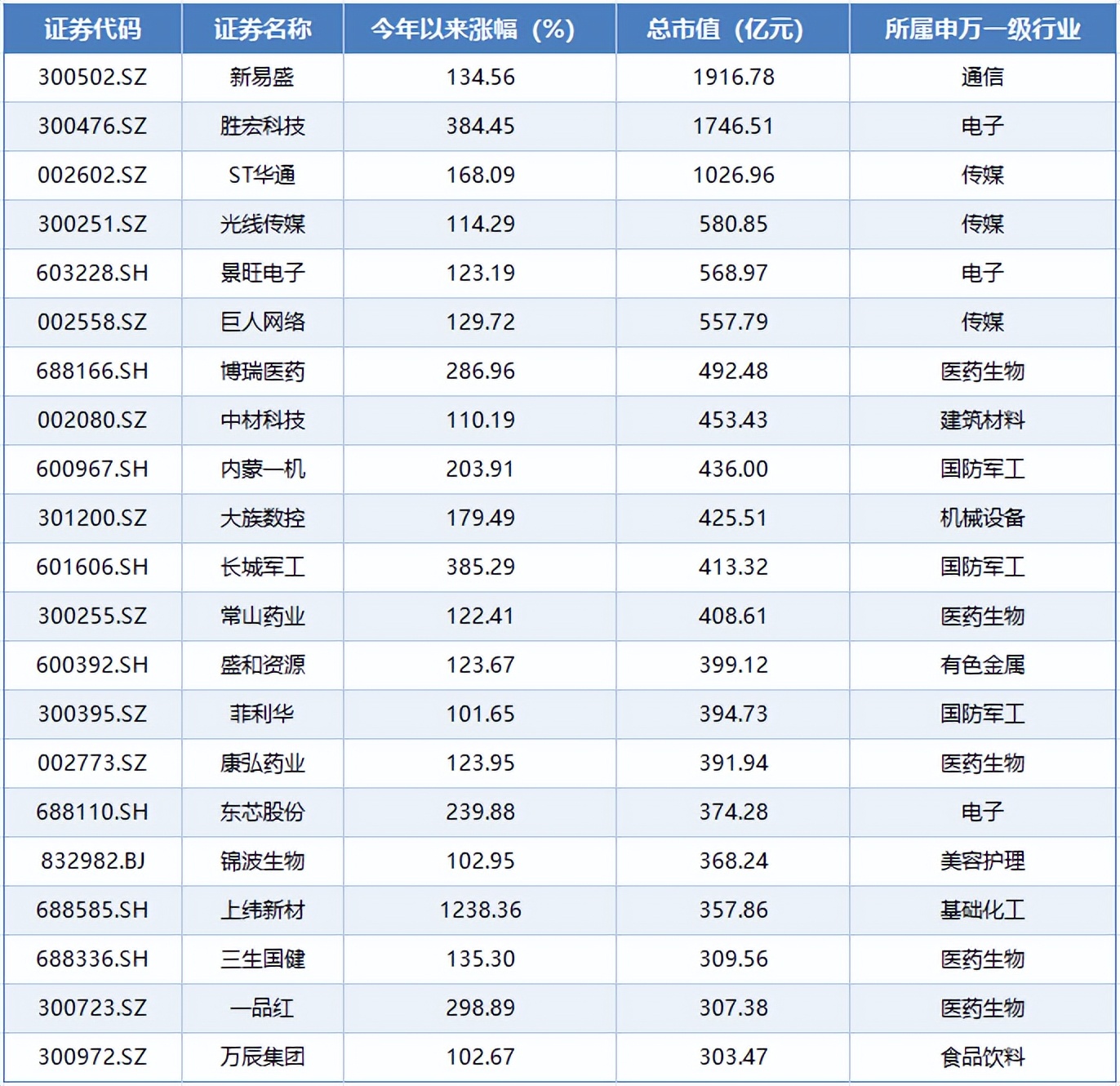 具体来看,截至8月11日收盘,上纬新材(688585.SH)今年累计上涨1238.36%,排在个股涨幅榜榜首。*ST宇顺(002289.SZ)、舒泰神(300204.SZ)紧随其后,分列第二、三位,今年以来累计涨幅分别为646.35%、601.75%。排在第四至第十位的分别是联合化学(301209.SZ)、长城军工(601606.SH)、胜宏科技(300476.SZ)、北方长龙(301357.SZ)、菲林格尔(603226.SH)、*ST亚振(603389.SH)、昂利康(002940.SZ),这些个股累计涨幅均超过300%。