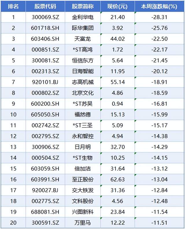 本周个股跌幅榜前五位分别是金利华电、际华集团、天富龙、*ST高鸿、恒信东方,累计跌幅分别为28.31%、25.76%、22.50%、22.17%、21.45%。