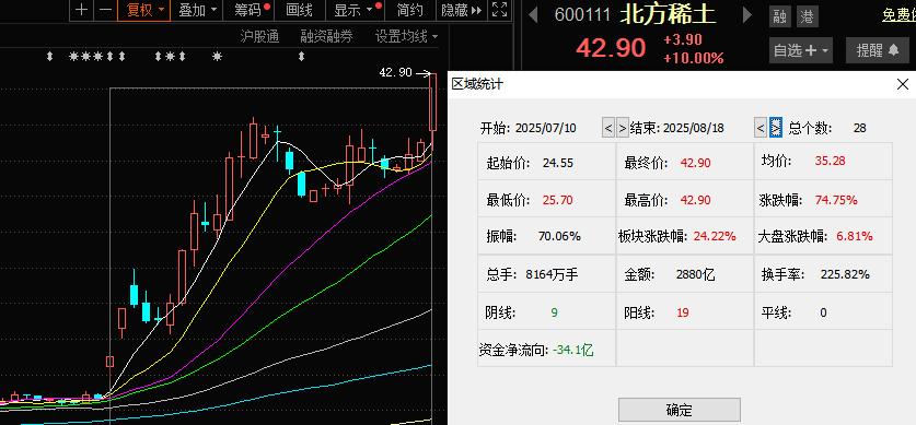 北方稀土股价自7月10日起涨势不断,8月18日再度涨停,并触及年内高点报42.90元/股,期间累计涨幅达74.75%,换手率达225.82%,市值突破1550亿元。