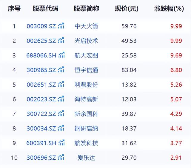 8月20日,军工板块拉升。截至收盘,中天火箭(003009.SZ)、光启技术(002625.SZ)、泰豪科技(600590.SH)涨停,恒宇信通(300965.SZ)、利君股份(002651.SZ)、海特高新(002023.SZ)、奥普光电(002338.SZ)、新余国科(300722.SZ)、钢研高纳(300034.SZ)等纷纷跟涨。