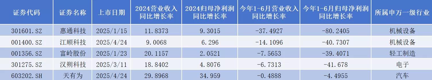 需注意的是,在2024业绩增长的情况下,2025年上半年,营收收入、归母净利润双双出现同比下滑的上市公司有5家,分别是惠通科技(301601.SZ)、江顺科技(001400.SZ)、富岭股份(001356.SZ)、汉朔科技(301275.SZ)、天有为(603202.SH)。