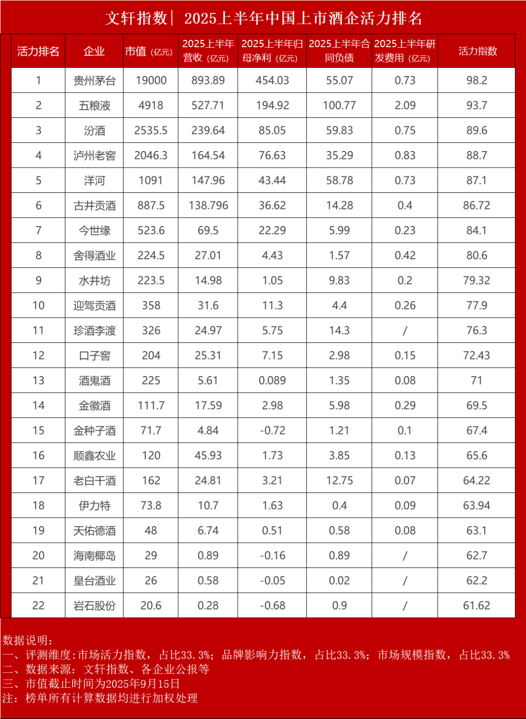 对此,文轩指数推出2025上半年白酒企业活力排名,活力是企业发展的必备条件,是创新和适应市场变化的内在能力,我们从多项数据维度评判白酒企业的活力指数,试图探究白酒行业的一些发展趋势。