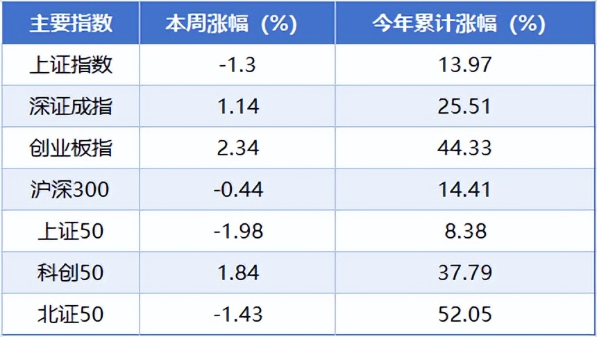 本周(9月15日至9月19日),A股三大指数涨跌互现。截至周五收盘,上证指数累计下跌1.3%,深证成指累计上涨1.14%,创业板指累计上涨2.34%。