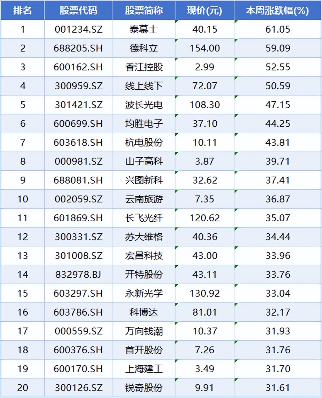 个股方面,本周个股涨幅榜前五位分别是泰慕士、德科立、香江控股、线上线下、波长光电,累计涨幅分别为61.05%、59.09%、52.55%、50.59%、47.15%。