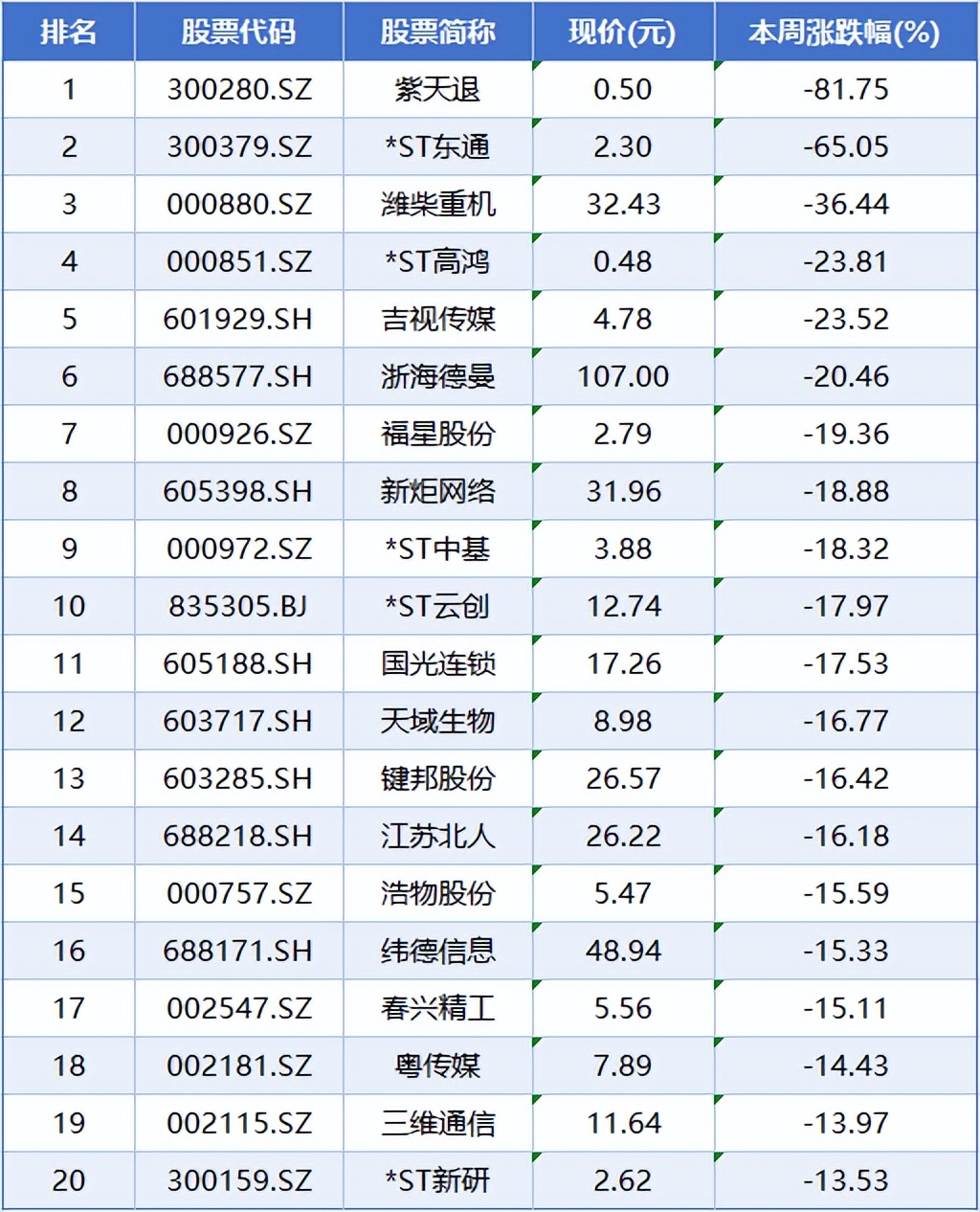 本周个股跌幅榜前五位分别是紫天退、*ST东通、潍柴重机、*ST高鸿、吉视传媒,累计跌幅分别为81.75%、65.05%、36.44%、23.81%、23.52%。