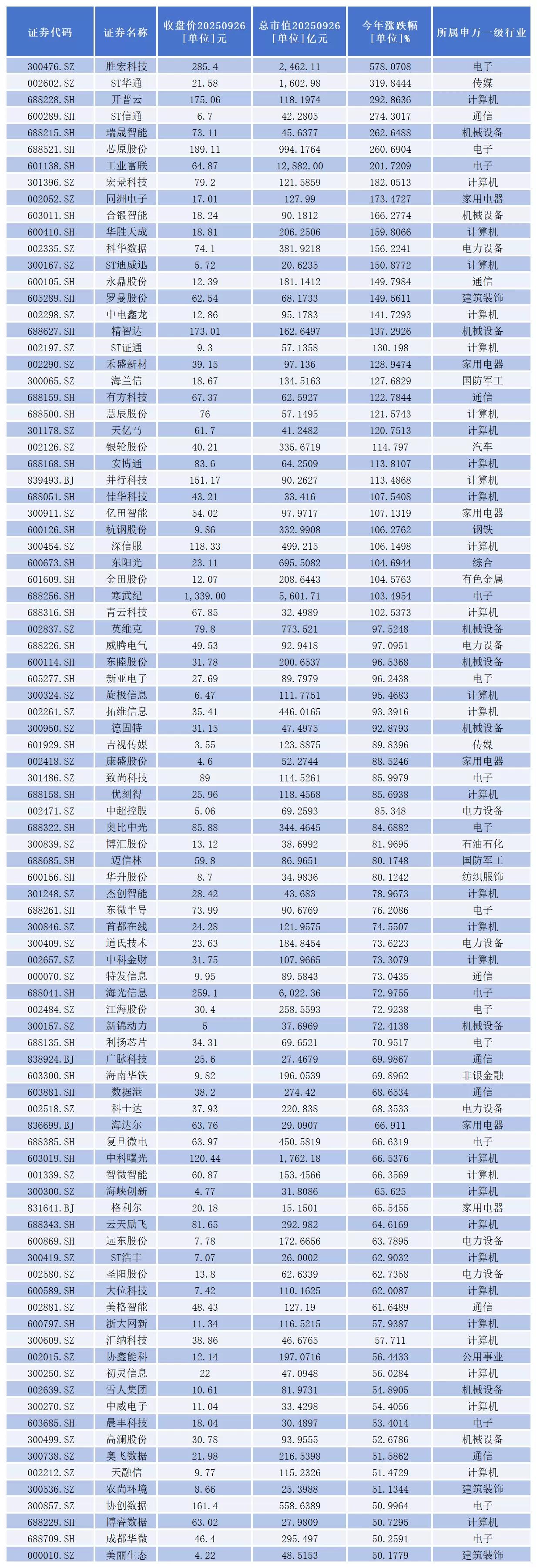 从二级市场表现看,今年以来,股价涨幅超过50%的有91家,其中,34家成功实现翻倍,具体包括: