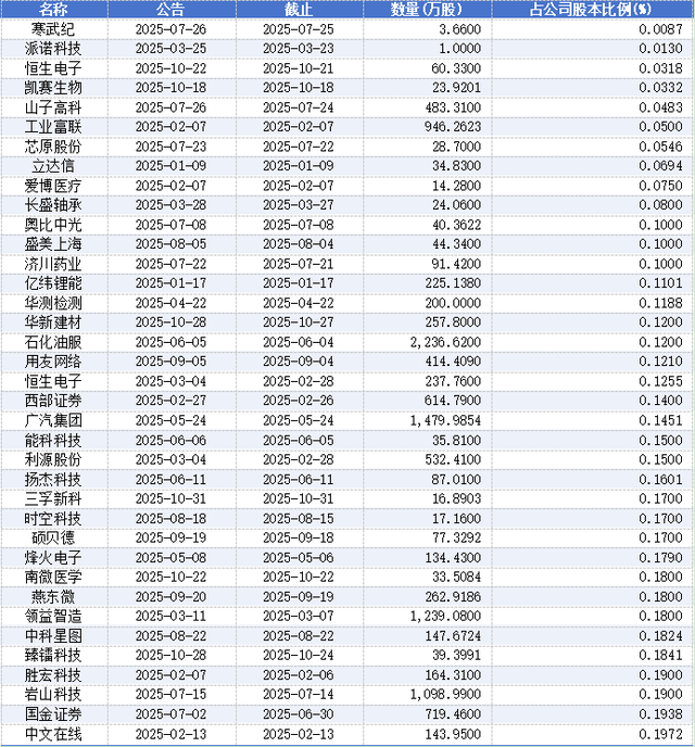 根据同花顺数据,除了寒武纪、山子高科之外,仍有超过30家公司的回购比例不达0.2%。