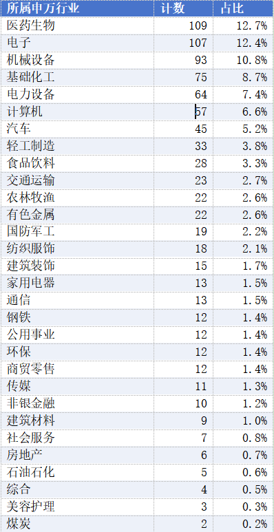 同花顺数据显示,医药生物行业进行了股份回购的公司有109家,占比为12.7%;电子行业进行了股份回购的公司有107家,占比为12.4%;机械设备行业进行了股份回购的公司有93家,占比为10.8%。