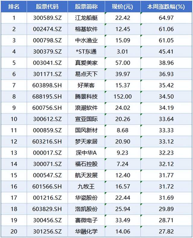 个股方面,本周个股涨幅榜前五位分别是江龙船艇、榕基软件、中水渔业、*ST东通、真爱美家,累计涨幅分别为64.97%、61.06%、61.05%、45.41%、38.96%。