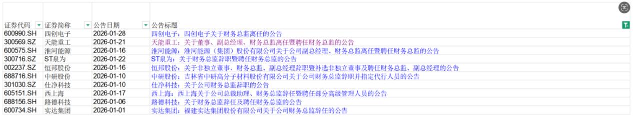 根据同花顺数据,有10个公告涉及财务总监离职,涉及企业包括四创电子、天能重工、淮河能源、ST泉为、恒邦股份、中研股份、仕净科技、西上海、路德科技、实达集团。