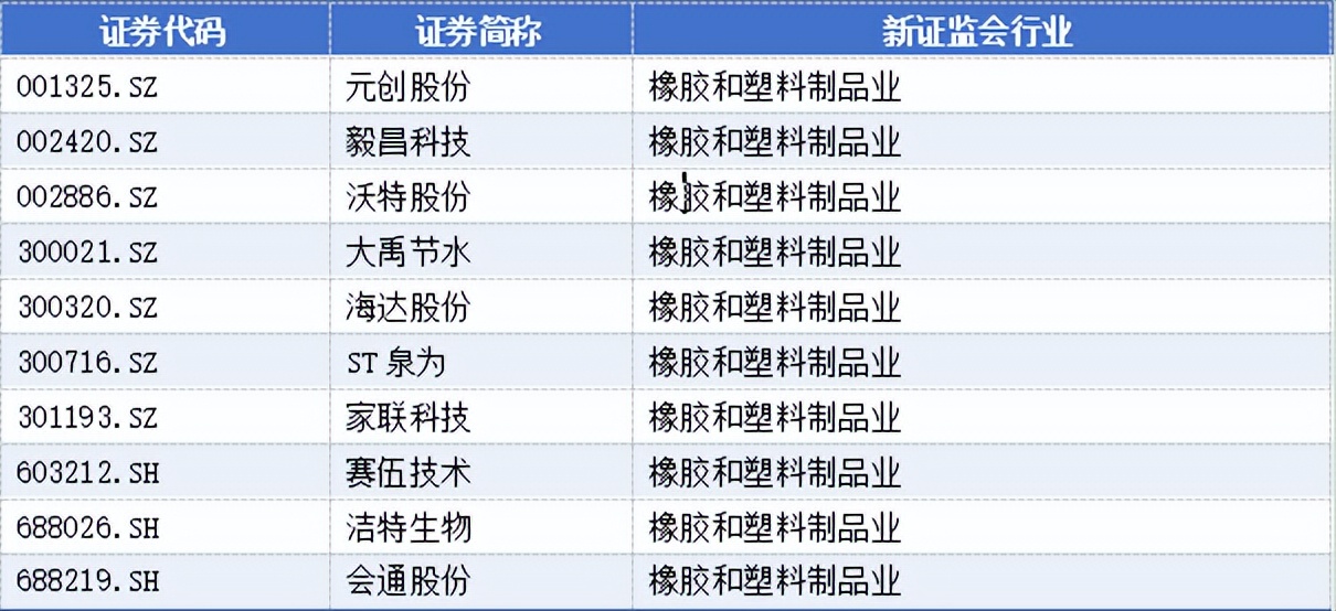 橡胶和塑料制品业有10家,分别为: