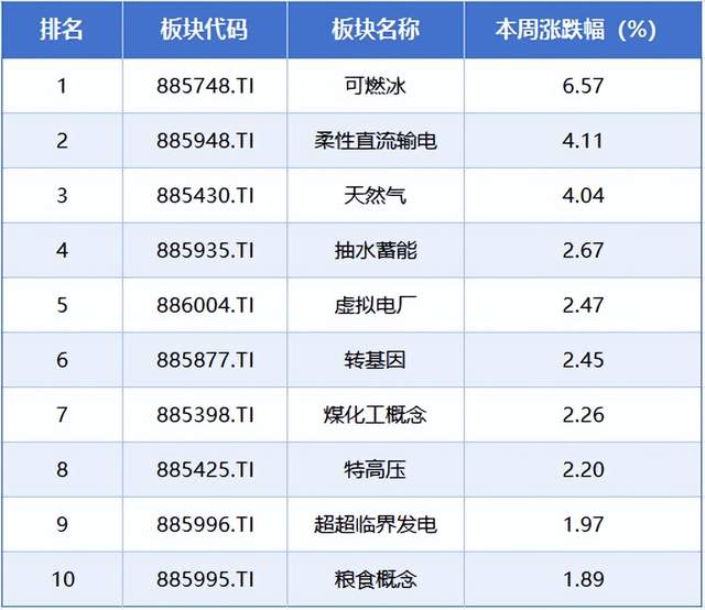 板块方面,本周涨幅居前的概念板块分别是可燃冰、柔性直流输电、天然气、抽水蓄能、虚拟电厂,累计涨幅分别为6.57%、4.11%、4.04%、2.67%、2.47%。