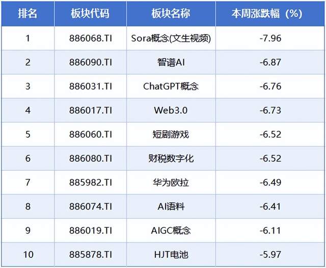 本周排在跌幅榜前排的概念板块分别是Sora概念(文生视频)、智谱AI、ChatGPT概念、Web3.0、短剧游戏,累计跌幅分别为7.96%、6.87%、6.76%、6.73%、6.52%。