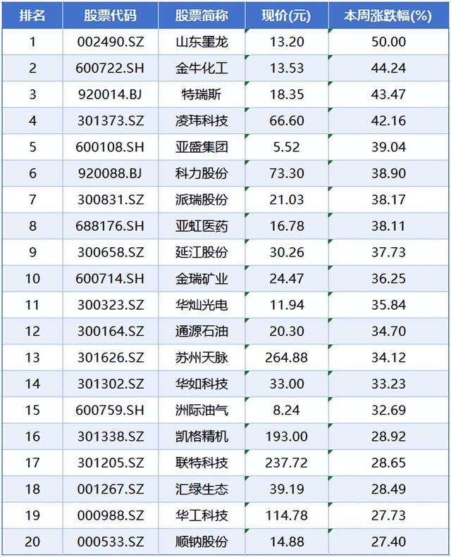 个股方面,本周个股涨幅榜前五位分别是山东墨龙、金牛化工、特瑞斯、凌玮科技、亚盛集团,累计涨幅分别为50%、44.24%、43.47%、42.16%、39.04%。