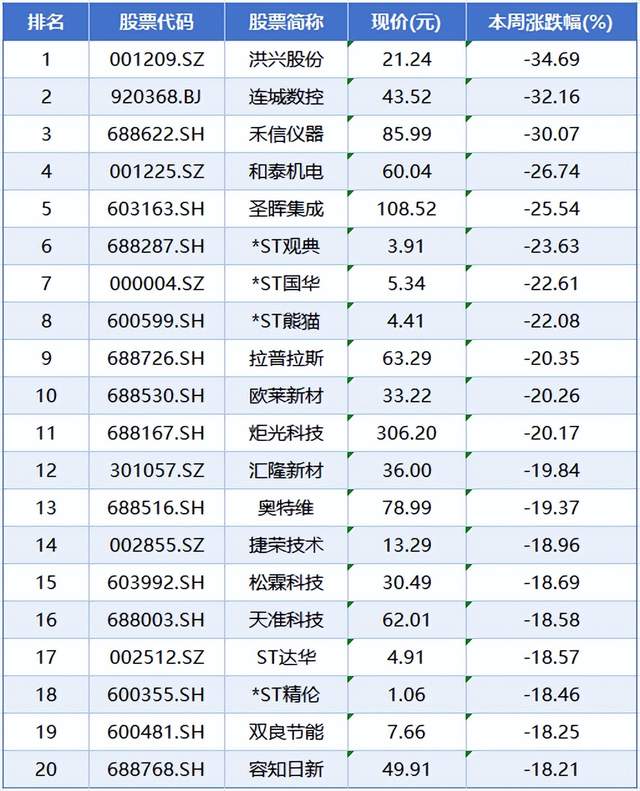 本周个股跌幅榜前五位分别是洪兴股份、连城数控、禾信仪器、和泰机电、圣晖集成,累计跌幅分别为34.69%、32.16%、30.07%、26.74%、25.54%。
