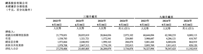 2024年三季报显示,网易在第三季度实现营收为262亿元,同比减少3.9%;归属于公司股东的净利润为65亿元,同比下降16.67%,出现营利双降的情况。