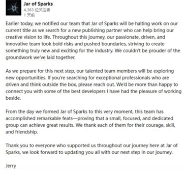 近日,网易西雅图工作室Jar of Sparks的设计总监Jerry Hook在领英上发布消息,表示工作室已决定暂停当前项目的出版工作,原因是需要寻找新的发行合作伙伴。尽管未明确提到裁员问题,但其透露团队成员正在探索新的机会。