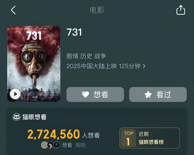 《南京照相馆》定档于7月25日全国上映,影片主要讲述一群生活在南京的普通百姓在吉祥照相馆避难,被迫帮助日本侵略者冲洗底片,却意外冲印出日本侵略者屠城罪证照片,进而谋划送出底片的故事。影片《东极岛》定档8月8日,主要讲述二战期间一段鲜为人知的真实历史,被称为“里斯本丸沉船事件”。影片《731》聚焦于揭露侵华日军731部队的细菌实验暴行,目前该影片想看人数已超过272万人。