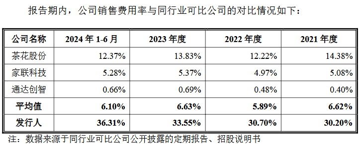 2021年至2023年及2024年上半年,太力科技的销售费用不断增加,分别约为1.88亿元、1.96亿元、2.80亿元、1.97亿元。同期,太力科技的销售费用率分别约为30.2%、30.7%、33.55%、36.31%;而同行可比公司的销售费用率平均值分别为6.62%、5.89%、6.63%、6.10%。