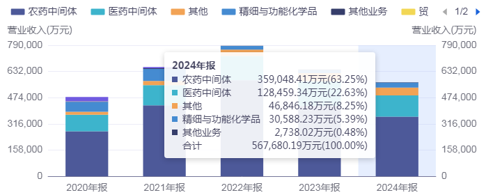 分业务来看,植保板块仍是联化科技的核心支柱,2024年贡献收入35.90亿元,占总营收的63.25%。医药CDMO板块方面,随着全球创新药研发外包需求持续释放,该业务实现营收12.85亿元。