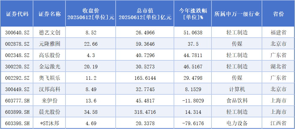 同花顺数据显示,截至6月12日收盘,A股盲盒概念一共有9家上市公司,具体包括德艺文创、元隆雅图、高乐股份、金运激光、奥飞娱乐、汉邦高科、来伊份、晨光股份、*ST沐邦。